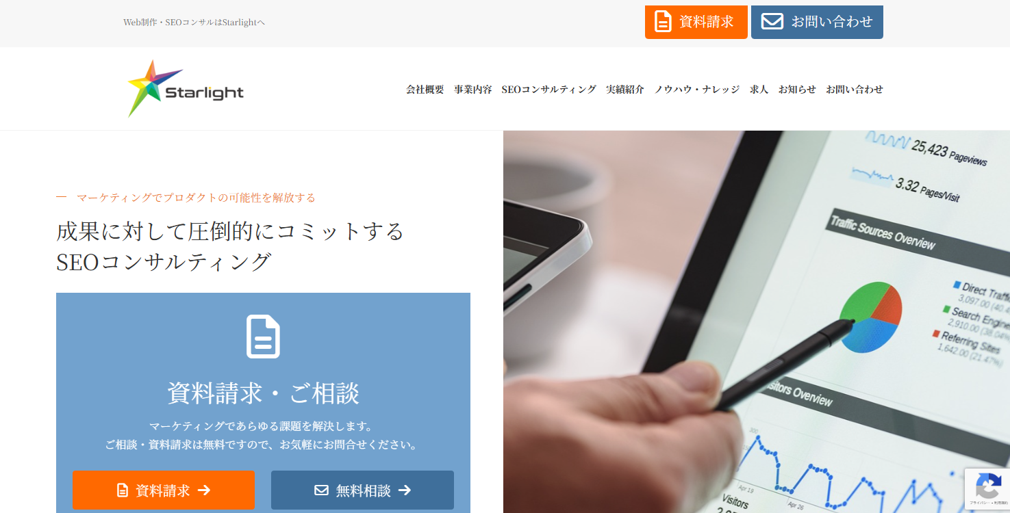 株式会社Starlightは、自社メディアで月間700万PVを達成した実績を基盤に、再現性の高いSEO施策を提供する会社です。SEOコンサルティングだけでなく、実行支援まで一貫して対応。コストパフォーマンスに優れたサービスで、多様な業界の企業をサポートしています。