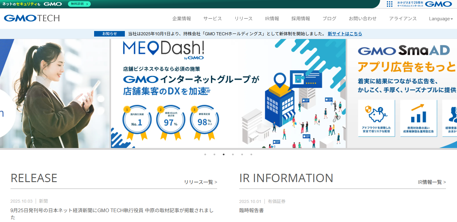 GMO TECH株式会社は2006年設立のWebマーケティング会社で、SEOやMEO、広告運用を得意としています。特にSEOでは外部施策・コンテンツSEO・テクニカルSEOを総合的にカバーし、戦略設計から実装支援までをワンストップで提供。Web集客における多様な課題解決をサポートしています。