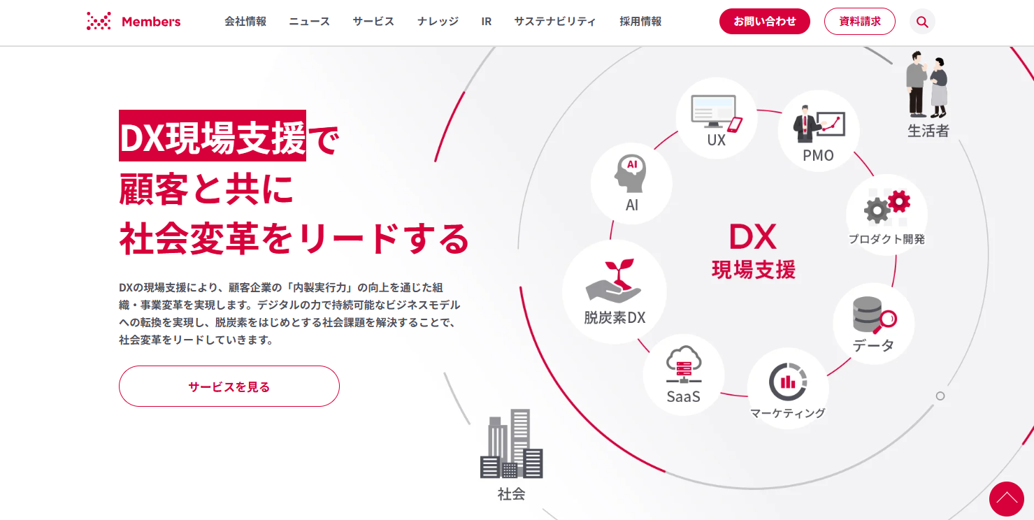 株式会社メンバーズは、デジタル領域全般におけるマーケティング支援を提供する企業です。大手企業向けにWebサイト戦略やSNS戦略の設計・運用を中心に、広告運用からサービス開発、DX推進まで幅広い相談に対応。総合的なデジタル活用を支援しています。