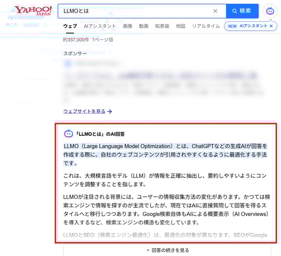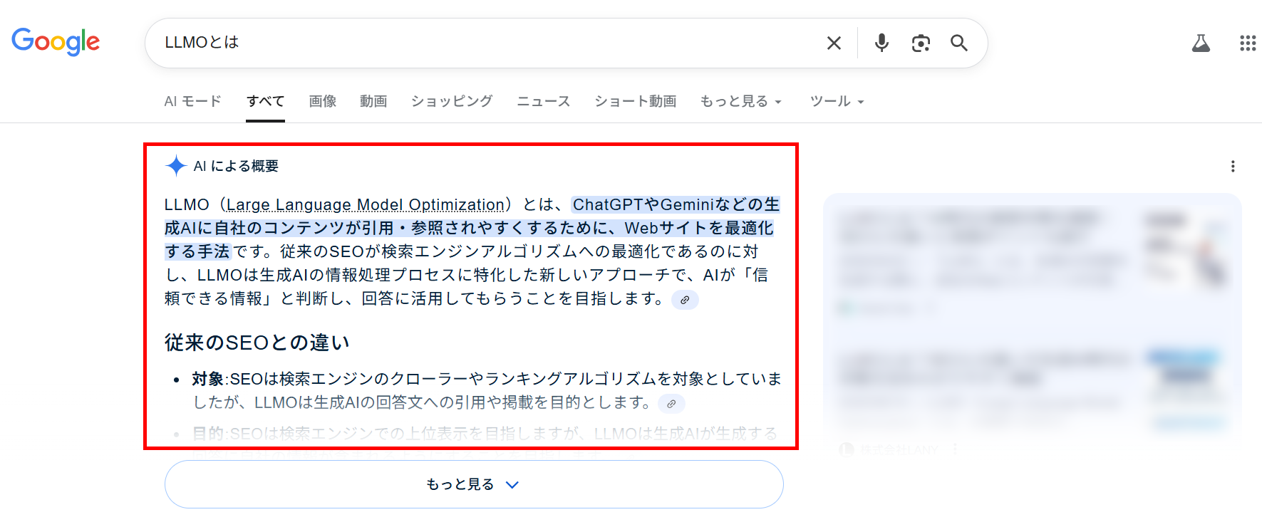 上記のとおり、LLMOに取り組み、AIに自社コンテンツが引用・言及されることによって、検索結果の上部に自社のコンテンツや社名・ブランド名などが表示されます。