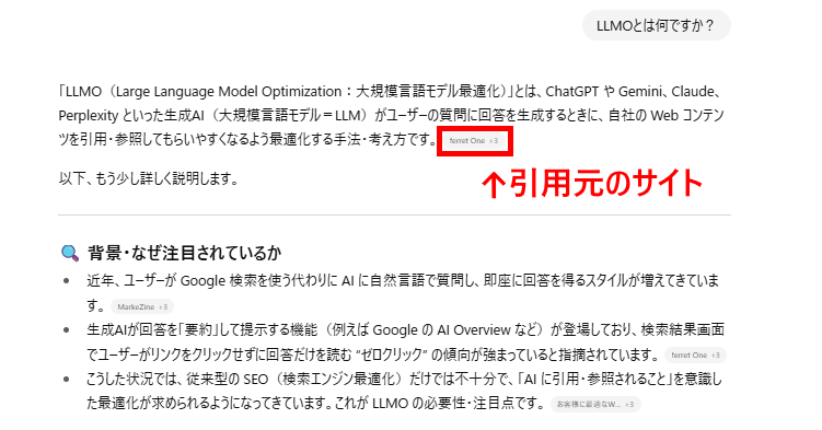 しかし、LLMOに取り組むことで、検索結果の上位にランクインしていなかったとしても、AIに自社のコンテンツを引用してもらえる可能性があります。