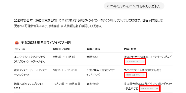 例えば、ChatGPTに「2025年のハロウィンイベントを教えてください」と質問した場合、以下のようにイベントをピックアップしてもらえますが、イベント名や開催日、会場、イベント内容はチャット上に簡単にまとめられるため、リンク先のページに飛ばずとも、ユーザーはイベントの概要を把握できます。